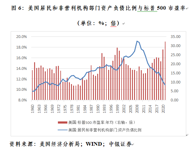 对美国居民和非营利部门资产负债比例与标普500市盈率年均值取自然对数后的相关性分析显示,1984至2021年二者为弱负相关0.227,其中2008至2021年为强负相关0.873。这表明,2008年全球金融危机以来,美国居民部门资产负债状况的改善受益宽流动性驱动的资产市场繁荣较多。其间,美国标普500市盈率年均值由16.02升至32.26倍,涨至1960年以来最高(见图6)。反过来,这也就意味着,如果美国股市和房市出现大幅调整,通过资产负债表渠道,将弱化美国居民和非营利部门的财务状况。同时,资产价格下挫还会产生负财富效应,导致居民消费倾向降低,进而影响美国企业部门的投资意愿和盈利状况。
