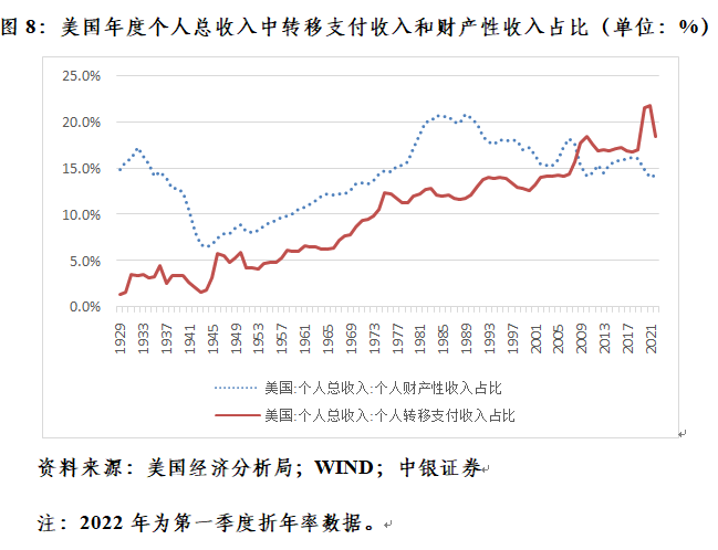 此外,姑且不论资产价格的未来表现如何,美国居民部门财务状况还要面对的一个现实挑战是财政刺激退坡。为应对公共卫生危机,美国政府“直升机撒钱”,采取了数轮家庭补贴措施。2020年和2021年,美国个人总收入中转移支付占比分别为21.6%和21.8%,远高于2015~2019年的平均占比17.0%,屡创1929年以来的新高。然而,随着家庭补贴计划到期且财政刺激减弱,个人转移支付占比快速下行,今年一季度该项占比折年率已降至18.5%,较上年平均水平回落3.3个百分点(见图8)。