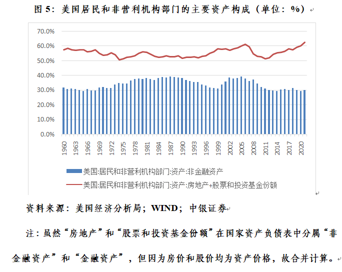 进一步分析美国居民和非营利机构部门的资产负债状况显示,到2021年底,该部门总资产总规模168.64万亿美元,其中:非金融资产规模50.43万亿美元,占到29.9%,较2008年底下降了7.3个百分点,占比处于1960年以来的9.8%分位,处于历史低位;金融资产规模118.22万亿美元,占比70.1%,上升了7.3个百分点,占比处于历史高位。同期,该部门“非金融资产”项下的房地产与“金融资产”项下的股票和投资基金份额规模合计105.53万亿美元,占比62.6%,上升了8.0个百分点,占比为1960年以来最高(见图5)。