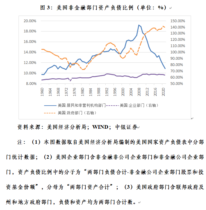 以上三个口径的数据可以交叉印证,2008年金融危机以来,美国居民部门资产负债比例改善,企业部门基本稳定,而政府部门都是扮演着加杠杆的角色。