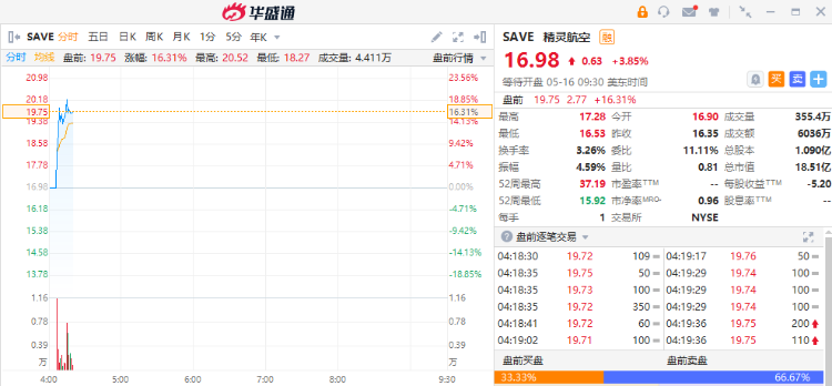 华盛资讯5月16日消息,美股盘前,Spirit Airlines(SAVE)涨超16%,据华尔街日报,捷蓝航空(JBLU)计划以每股30美元现金的价格对Spirit Airlines提出收购要约。