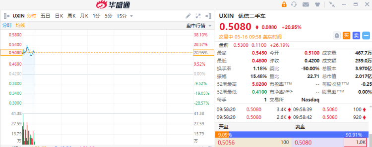华盛资讯5月16消息,部分中概股盘初走高,优信二手车盘中大涨逾20%,今日宣布再获愉悦资本和蔚来资本追加1亿美元新融资。
