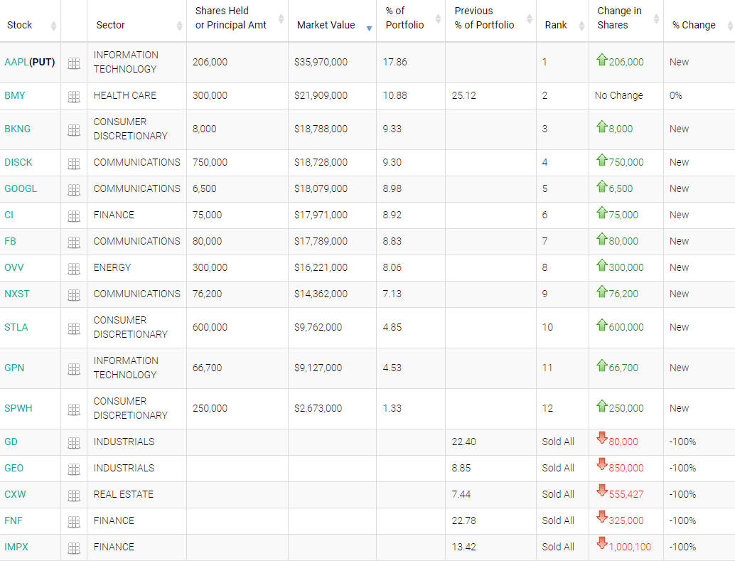 截至一季度末,伯里持有的美国股票总价值(不包括期权)增长了122%,达到1.65亿美元。其最大的多头头寸是在百时美施贵宝持有的价值2200万美元股份,在Booking Holdings和Discovery持有的价值约1900万美元股份,以及在Alphabet持有的1800万美元股份。