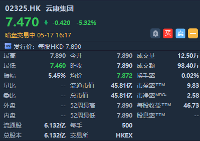 华盛资讯5月17日讯,医学检测机构云康集团 $02325.HK 暗盘平开,现跌5.32%,报价7.47港元,最新总市值超45亿港元。该股预计将于明日(5.18)正式港股挂牌上市。