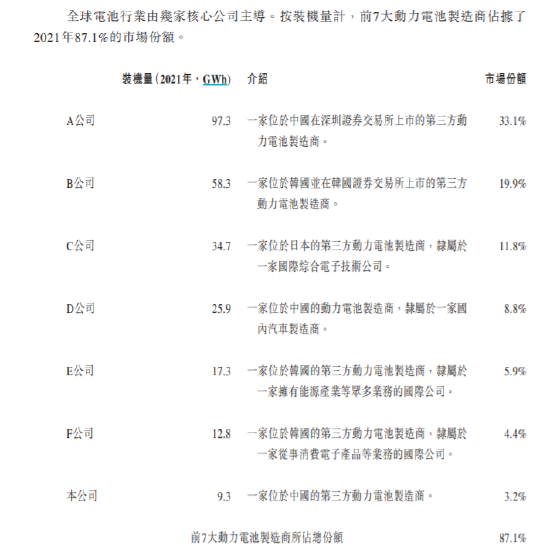 根据招股书,在2021年全球七大动力电池占据全球市场87.1%的市场份额,宁德时代市场份额33.1%,韩国LG化学占比19.9%,日本松下占比11.89%,比亚迪占比8.8%,韩国SK On占比5.9%,韩国三星SDI占比4.4%,中创新航占比3.2%。在中国市场,宁德时代市场份额52.1%,比亚迪16.2%,中创新航5.9%。