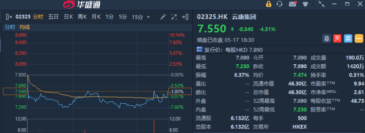 华盛资讯5月17日讯,医学检测机构云康集团 $02325.HK 暗盘平开,尾盘收跌4.31%,不计手续费一手账面浮亏170港元,最新总市值超46亿港元。该股预计将于明日(5.18)正式港股挂牌上市。