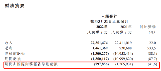 京东物流公布一季度业绩,公司2022年一季度实现收入273.51亿,同比增加22%,公司实现经调整亏损7.98亿元,去年同期亏损13.66亿元,同比亏损减少41.6%。