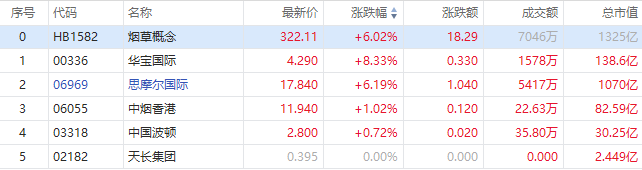 华盛资讯5月20日消息,港股烟草股拉升走强。截至发稿,华宝国际涨8.33%,报4.29港元每股;思摩尔国际涨6.19%,股价报17.84港元,成交额5417万港元;中烟香港涨1.02%,中国波顿涨0.72%。