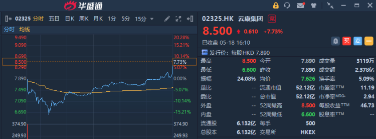 华盛资讯5月18日讯,医学检测机构云康集团 $02325.HK 首挂平开,盘中一度跌超16%,尾盘收涨7.73%,一手账面浮盈305港元,全日成交额2.38亿港元。