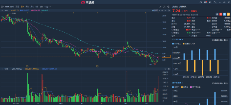 JMIA上涨1.71美元收于7.24美元,该反弹扩大了涨幅,使股价进一步脱离上周创下的52周低点4.48美元。