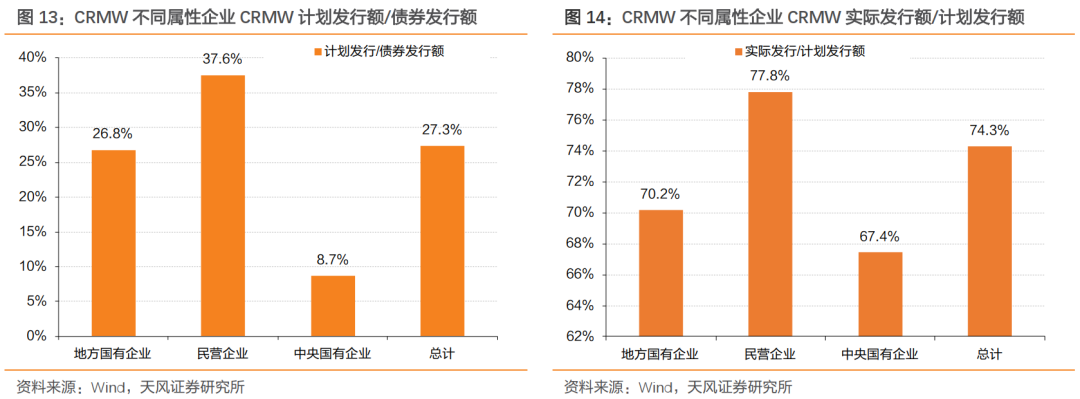 CRMW创设规模远低于标的债券发行规模。整体上,CRMW的计划发行额与债券发行额仅为27.3%,CRMW创设覆盖率整体较低;分企业属性来看,央企的创设覆盖率最低,仅为8.7%,民企的创设覆盖率相对最高,为37.6%。而从CRMW的创设规模和实际发行规模比较来看,还可以发现部分CRMW本身也未完全投满。整体上,CRMW的实际发行额占计划发行额74.3%,分企业属性来看,央企实际发行额/计划发行额最低,为67.4%,民企最高,为77.8%。