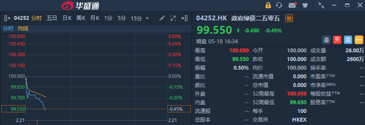 华盛资讯5月18日讯,政府绿债二五 $04252.HK 今日暗盘交易,现跌0.45%,成交额2600万港元,将于明日正式挂牌联交所交易。