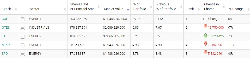Enterprise Products(EPD.US)位列第五,持仓约5765万股,持仓市值约14.88亿美元,较上季度持仓数量减少了8%。