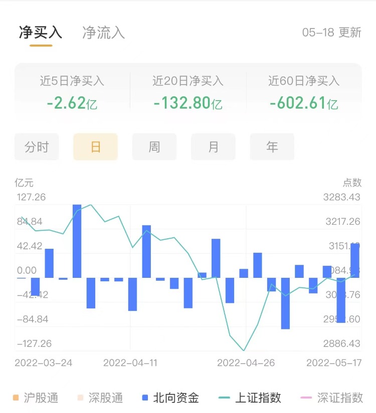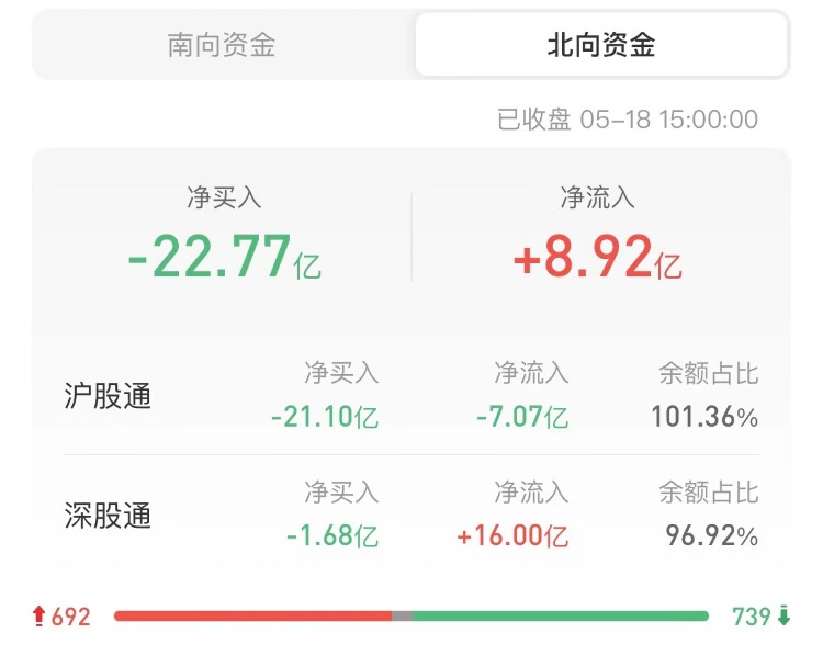 北上资金今日净卖出22.77亿元,沪股通净卖出21.1亿元,深股通净卖出1.68亿元。上一交易日净买入59.60亿元。