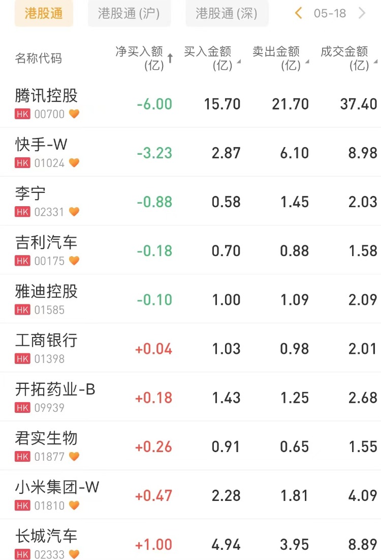 南下资金净卖出腾讯控股 $00700.HK 6亿港元,为今日卖出之最,净卖出快手 $01024.HK 3.23亿港元。