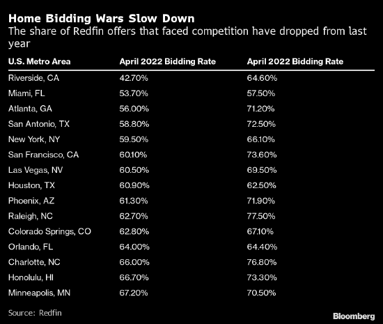 经历了两年疫情推升的购房狂潮之后,随着抵押贷款利率升至2009年以来最高,对挂牌房源的竞争显露降温迹象。根据新的Redfin报告,4月份有61%的房源面临竞标,这一比例低于一个月前的63%和2021年同期的67%。Redfin的经纪如果收到至少一个其他竞标,那么这笔交易就被视为进入竞标战。