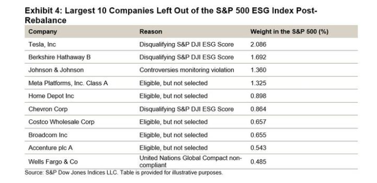 全球电动车龙头特斯拉昨日被标准普尔道琼斯指数公司从标普500 ESG (环境、社会和公司治理) 指数中移除,同时被移除的还有伯克希尔、强生、Meta等,指数公司主管Dorn指出,从更广泛的ESG角度来看,它已经落后于同行。消息公布后,特斯拉日内跌近7%。马斯克表示,“这简直是骗局,(美国能源巨头)埃克森美孚竟被标普500评为ESG (环境、社会和公司治理) 前十名,而特斯拉没有上榜!”