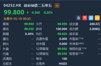 华盛资讯5月19日讯,政府绿债二五 $04252.HK 今日首挂低开0.05%,现跌0.20%,报价99.80港元,当前成交额2600万港元。零售绿债保底息率达2.5厘,即每年每手派息最少250港元,全期派息共最少750港元。