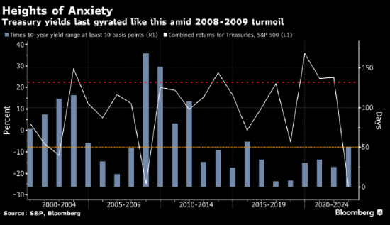 2022年迄今已有95个交易日,10年期美国国债收益率单日交易幅度至少为10个基点的有50日。这使今年全年有望超过130日,这将是自2009年以来的最高水平。收益率在隔夜大跌后,周四小幅走高。