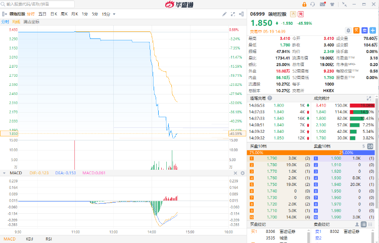 5月19日消息,继正荣地产、天誉置业、佳源国际后,又一只房企闪崩,港股领地控股午后大跌45.59%,现报1.85港元每股,市值只剩19亿港元,涉资184万港元。