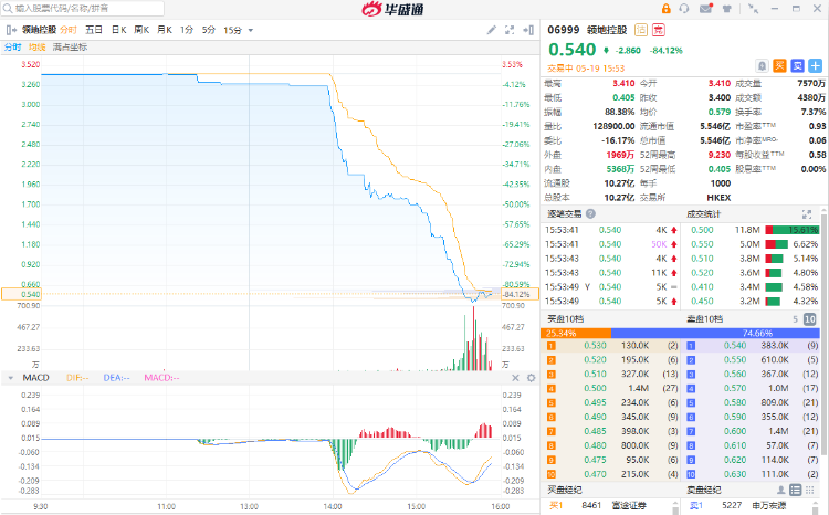 5月19日消息,继正荣地产、天誉置业、佳源国际后,又一只房企闪崩,午后领地控股跌幅不断扩大,截至发稿,领地控股跌84%,股价不足1港元,市值5.5亿港元,成交额只有4380万港元。领悦服务集团跌超66%。