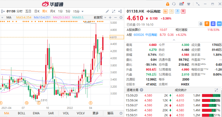 - 中金此前发布研报表示,中远海能首季收入同比增长13%,盈利则同比跌93%,符合该行预期,相信主因期内油轮运价仍处于低位和政府补贴同比减少所致。今年首季油轮航运市场供过于求,特别是超大型油轮船期当量费率水平低,令首季公司油轮船队毛利率下降6%至1%。该行预计,市场或将触底反弹,建议投资者于上行周期入市,因为行业估值仍处于低位,上升空间较大。维持中远海能“跑赢大市”评级,目标价上调至5.09港元。