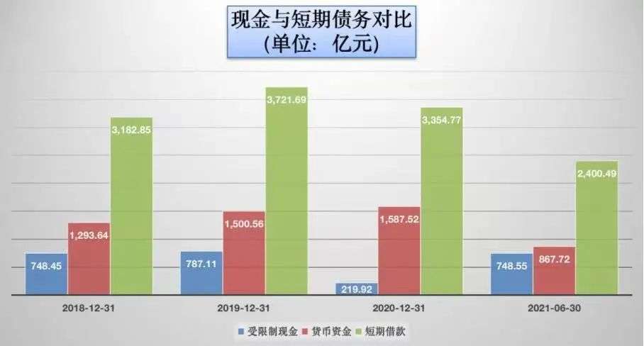 截至2021年半年报,中国恒大账上可灵活调度的货币资金只有868亿元,相比之下,一年内到期的短期负债高达2400亿元,只有后者的36%。即便加上受限货币资金749亿元,比例也只有67%。可以说,恒大账上的货币资金根本无法覆盖有息负债。