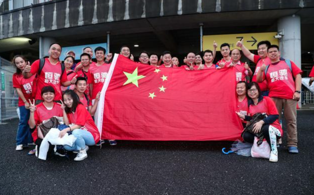 赛前的天河体育场内,恒大球迷同袍一心,胸前印着两个字--恒驰。