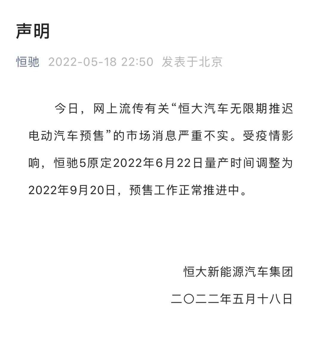 随后,恒驰官方微信做出声明:有关“恒大汽车无限期推迟电动汽车预售”的市场消息严重不实。受疫情影响,恒驰5原定2022年6月22日量产时间调整为2022年9月20日,预售工作正常推进中。