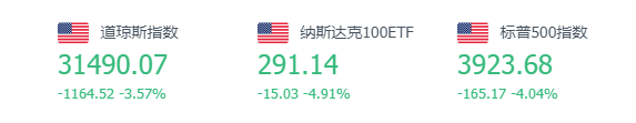 美股三大股指周三全线收跌。道指跌3.57%报31490.07点,为2020年10月以来的最大跌幅。标普500指数跌4.04%报3923.71点,创2020年6月以来的最大跌幅。纳指跌4.73%报11418.15点。