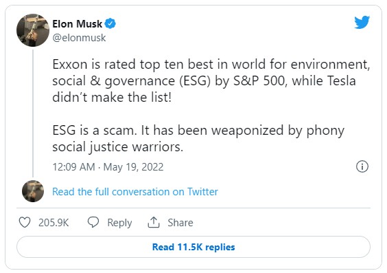 周三,全球指数供应商标普道琼斯指数宣布,将全球最大电动汽车制造商特斯拉从标普500 ESG指数中剔除。对此,马斯克发推表示:“埃克森美孚都被标普500排在全球ESG前十,特斯拉却没能上榜!”“ESG就是一个骗局,它被那些伪装成社会正义斗士的家伙当成枪使。”他还指责标普评级“已经丧失了他们的诚信”。