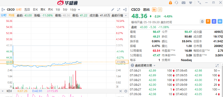 思科 $CSCO 盘前一度大跌逾14%,公司第三财季营收逊于预期