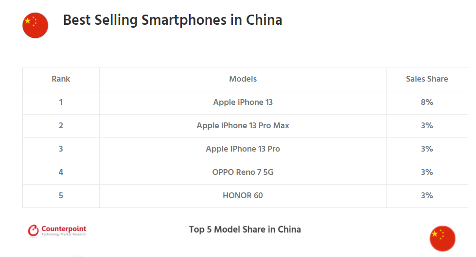 在Counterpoint Research 公布的8个国家最畅销手机报告中,中国市场最畅销的手机前五名分别是iPhone 13、iPhone 13 Pro Max、iPhone 13 Pro、OPPO Reno 7和荣耀60。其中,iPhone 13的三款机型占据了14%的销售份额,取得了亮眼的成绩。