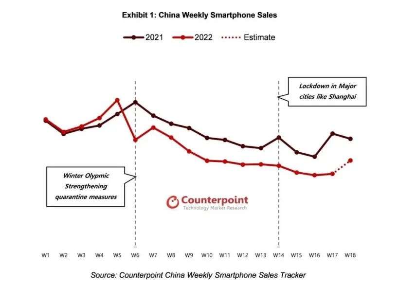 Counterpoint Research 发布的最新报告显示,中国智能手机销量已经连续下降10周,虽然部分热销机型带来的购买波动让部分时间段有所回涨,但是整体下滑是主要趋势。可以看到,在红米K50系列发布的时间段,销量的下降有所平缓,但是仅靠一款机型的热卖显然无法挽救整体的下滑。