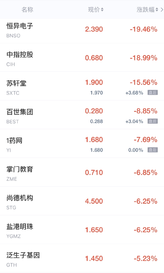 法拉第未来、百世集团跌近9%,尚德机构跌超6%,网易有道跌超5%,贝壳、每日优鲜、携程跌超2%,优信跌超1%。