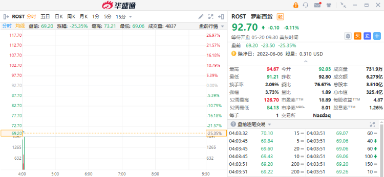 华盛资讯5月20日消息,美股盘前,罗斯百货(ROST)跌逾25%,公司一季度业绩不及预期。