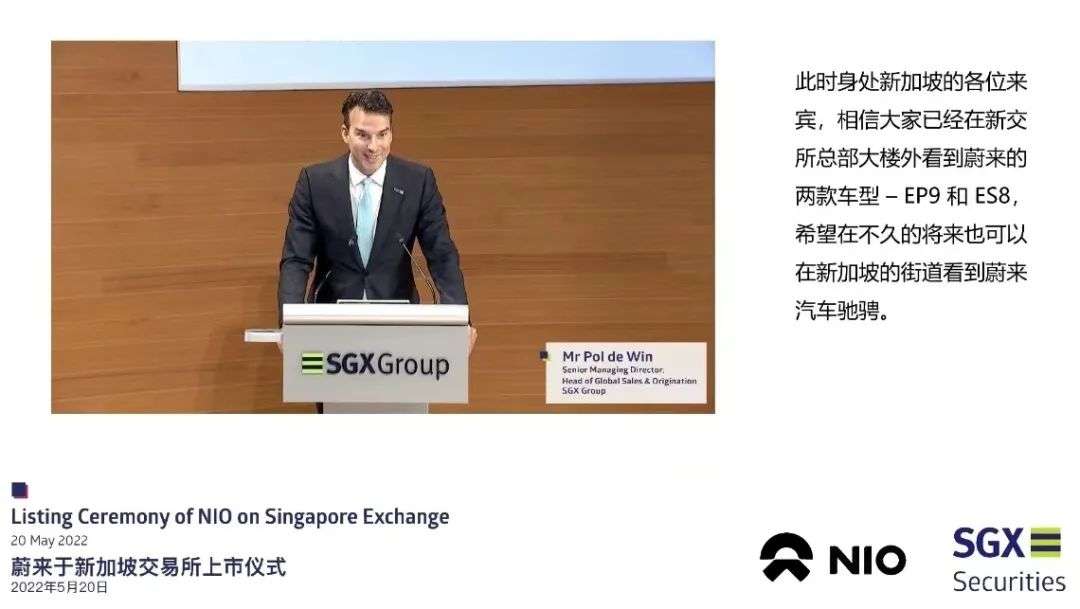 5月20日,蔚来在新加坡交易所主板成功上市,正式开始挂牌交易,股票代码为“NIO"。现场,一位澳门车主代李斌敲钟,蔚来成为全球首个三地上市的车企,同时也是首个同时在纽约、香港、新加坡上市的中国企业。