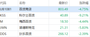 美股百货商店板块持续走低,科尔士百货(KSS)跌超9%,诺德斯特龙跌超5%,梅西百货跌超4%,狄乐百货跌超2%。