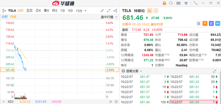 特斯拉盘中跌超3%,现报681.46美元。CEO埃隆·马斯克今日表示,预计特斯拉将在大约一年后将推出不需要人工驾驶的自动驾驶汽车。