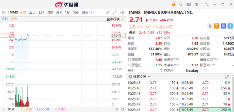 $IMMX 盘中暴涨超66%,消息面上,ImMix Biophma强调其IMX-110显示出比强生Janssen公司FDA批准的治疗结缔组织癌软组织肉瘤相关药物Trabectein更高的生存率。