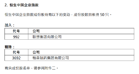 恒生公司:联想集团被纳入恒生国企指数,瀚森制药被剔除