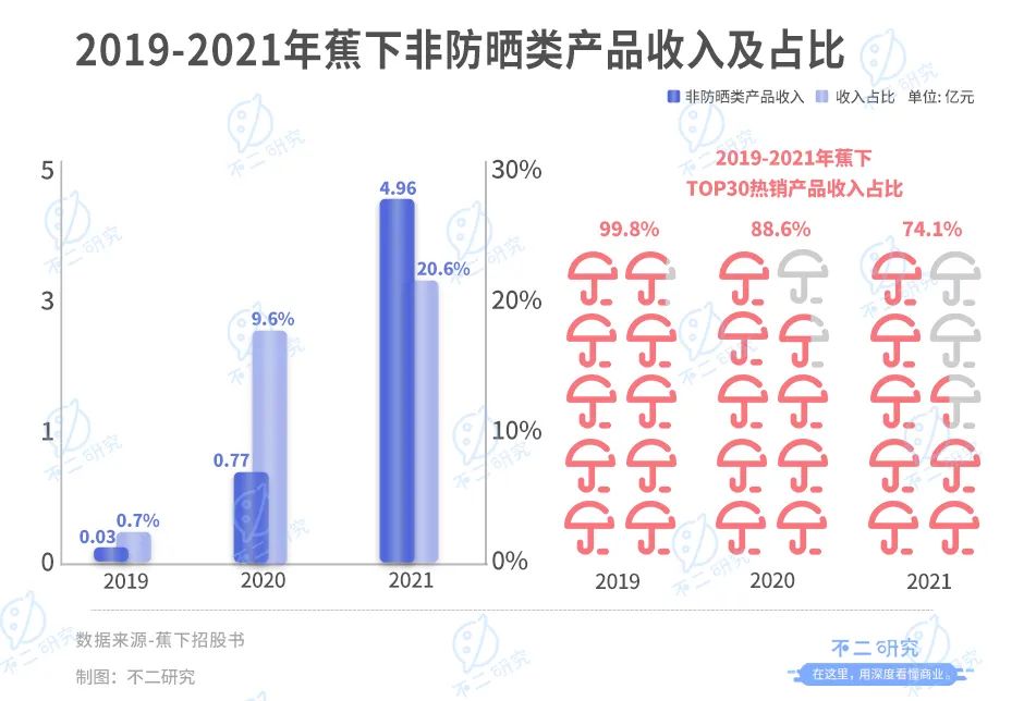 综合品类来看,2019-2021年,蕉下非防晒类产品收入分别为0.03亿元、0.77亿元、4.96亿元,营收占比分别为0.7%、9.6%和20.6%。