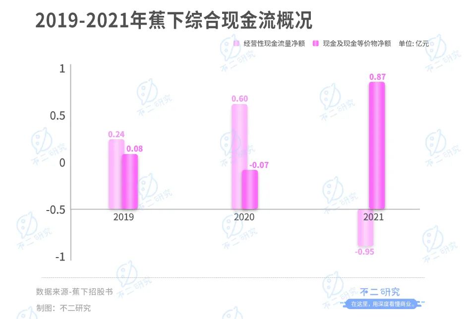 此外,蕉下在2019-2021年的经营性现金流量净额分别为2410.9万、6022.3万、-9501.9万元,已经出现经营性现金流出的现象。