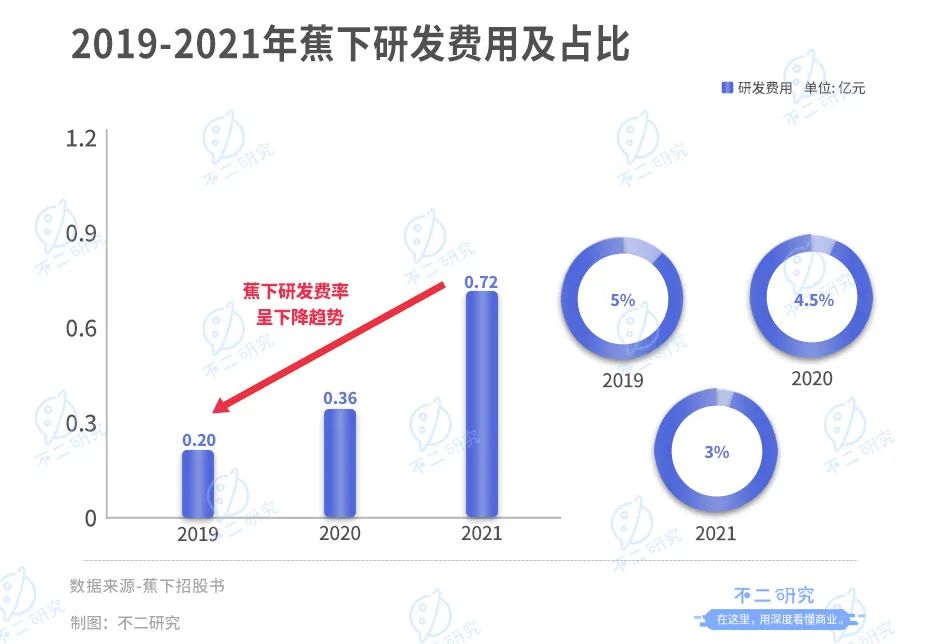 与逐年高企的营销费用相比,蕉下的研发费率却呈下降趋势。2019-2021年,其研发支出为0.20亿、0.36亿及0.72亿元,在同期营收占比分别为5%、4.5%及3%。