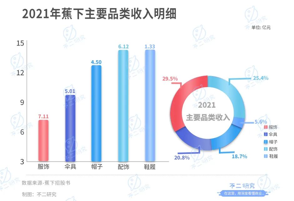 以蕉下2021年的营收为例,来自服装销售的营收为7.11亿元,占比29.5%;来自伞具的销售收入为5.01亿元,占比20.8%;来自帽子的销售收入为4.50亿元,占比18.7%,墨镜、口罩、袖套及手套等其他配饰共实现营收6.12亿元,占比25.4%,鞋履销售收入1.33亿元,占比5.6%。