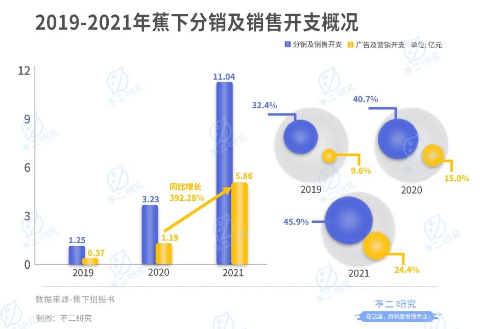 或由于此,伴随互联网获客成本不断增高,蕉下的的广告及营销开支也在不断增长:2019-2021年分别为 0.37亿、1.19亿、5.86亿,在同期营收占比9.6%、15.0%、24.4%。仅在2021年,蕉下的广告及营销开支比去年暴增392.28%。2019-2021年,蕉下的分销及销售开支为1.25亿、3.23亿、11.04亿,同期营收占比分别为32.4%、40.7%及45.9%