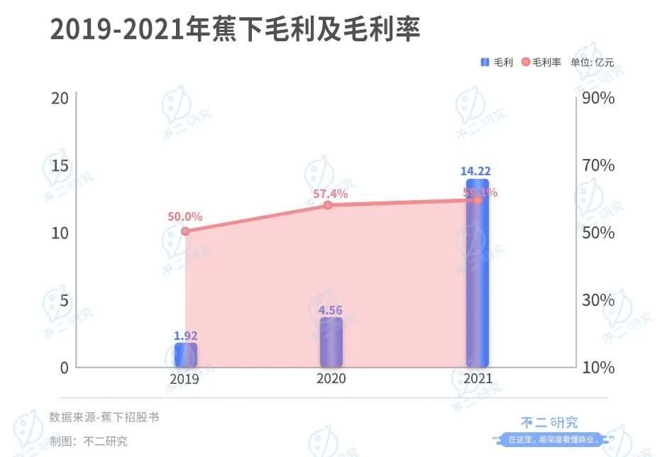 2019-2021年,蕉下的营收为3.85亿、7.94亿、24.07亿元,2021的年复合增长率达到204%;同期,其毛利率也高达50.0%、57.4%、59.1%,两年间提升了9.1个百分点。