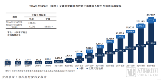 从商业化速度来看,支气管镜手术机器人在全球的装机速度较快。根据弗若斯特沙利文的报告,经自然腔道手术机器人全球市场规模近年持续快速增长,由2016年的人民币2140万元增至2020年的人民币5.2亿元,年复合增长率为122.2%,预期2030年将进一步增至人民币257.4亿元,年复合增长率为47.7%。