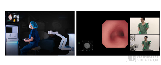 医生操作柔性手术机器人(左)与操作内窥镜(右)
