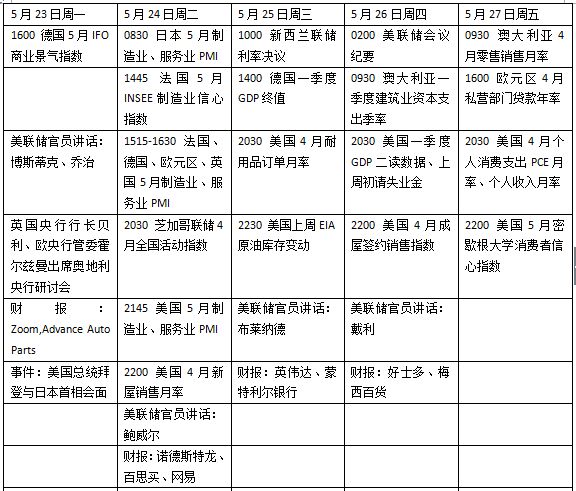 本周看点颇多,美联储将公布5月会议纪要,美国将公布4月个人消费支出物价指数(PCE)、采购经理人指数(PMI)等重要数据,多位美联储官员将发表讲话。数家零售商将披露业绩,或进一步显示通胀对消费者的影响。多国央行将公布利率决议,新西兰联储料宣布加息50个基点,土耳其、印尼央行或按兵不动。